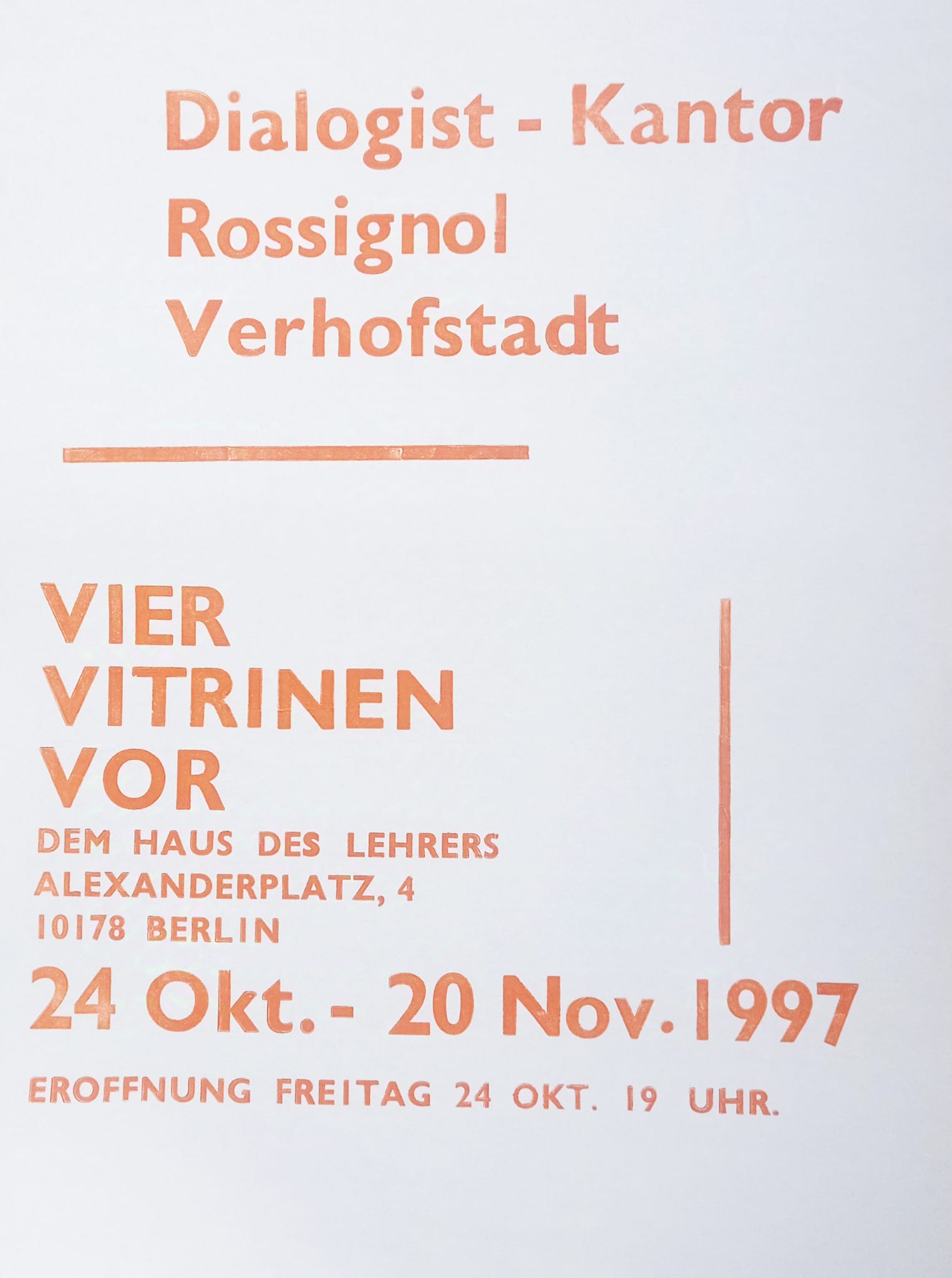 Affiche typo expo vitrines de Dem Haus Des Lehrers à Berlin. AlexanderPlatz,4. 1997 40 ex. Format A3