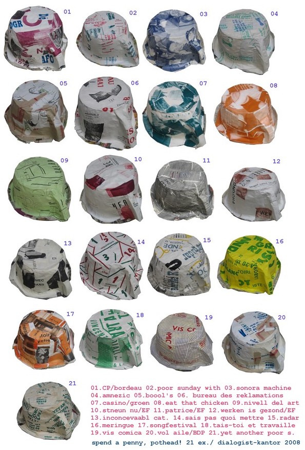 01.CP/bordeaux 02.poor sunday with 03.sonora machine 04.amnezic 05.b000l's 06. bureau des reklamations 07.casino/groen 08.eat that chicken 09.nivell del art 10.steun nu/EF 11.patrice/EF 12.werken is gezond/EF 13.inconcevaabl cat. 14.sais pas quoi mettre 15.radar 16.meringue 17.songfestival 18.tais-toi et travaille 19.vis comica 20.vol aile/BDP 21.yet another poor s. spend a penny, pothead! 21 ex./ dialogist kantor 2008