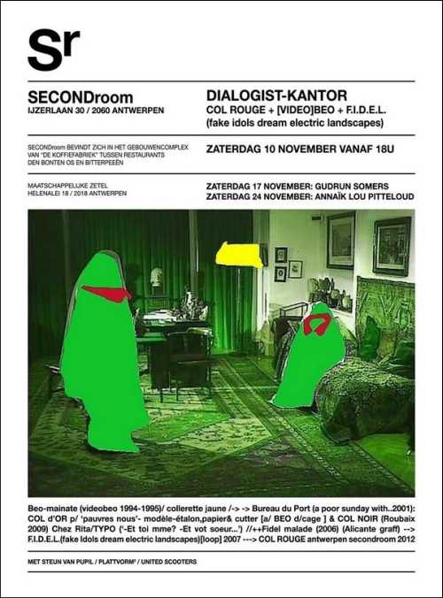 beo-mainate (videobeo 1994-1995)/ collerette jaune /-> -> Bureau du Port( a poor sunday with..2001):COL d’OR p/‘pauvres nous’- modèle-étalon,papier& cutter [a/ BEO d/cage ] & COL NOIR (Roubaix 2009) Chez Rita/TYPO (texte ?) // ++Fidel malade (2006) (Alicante Tag)–> F.I.D.E.L.(fake Idols dream electric landscapes)[loop]2007 –> COL ROUGE antwerpen secondroom 2012