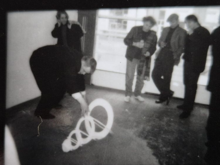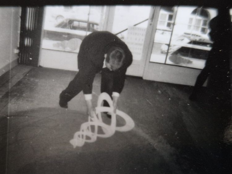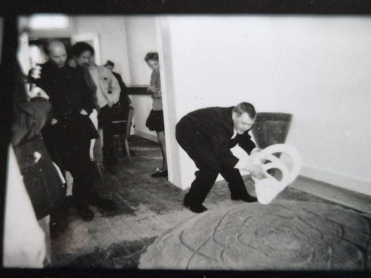 Ouverture de E.V.A. Malibran 05/06/1994. Installation de Marc Rossignol, activée à plusieurs reprises, avec différents modules cylindriques placés et roulés dans un cercle de sable d’un mètre de diamètre égalisé sur le plancher.